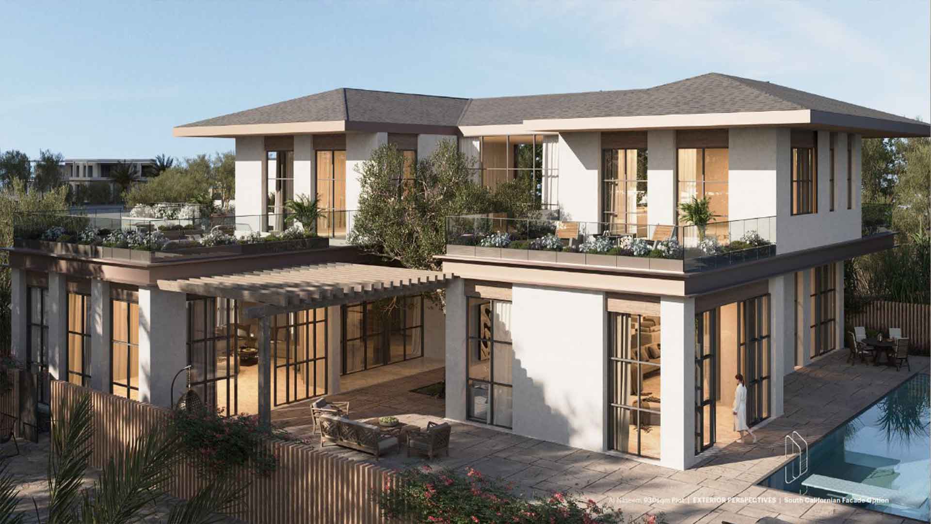 Al Naseem at Hudayriyat Central offers villas of South Californian Style & Modern Contemporary Style designs, with sizes ranging between 490 Sqm to 620 Sqm. The villa plot area ranges between 750 to 930 Sqm. Investors can buy a unit by paying a 10% booking amount online, with the sale offer price of Al Naseem villas starting at AED 7.8 million (tentative). The villa structure comprises a ground, and first-floor layout design, with each villa featuring a private swimming pool and landscaped gardens with various thematic architecture.
