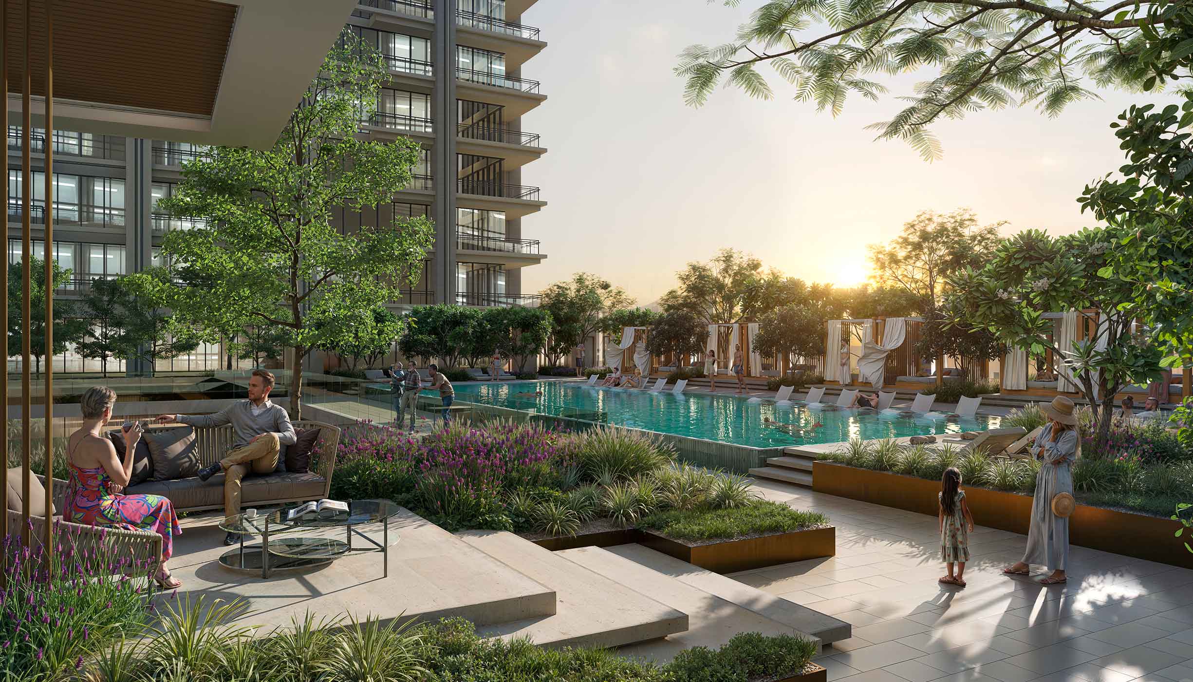 Residents can enjoy premium amenities including swimming pools, fitness centers, landscaped podium areas, luxury lobbies, retail and dining outlets, concierge services, and dedicated leisure spaces designed for urban comfort and convenience