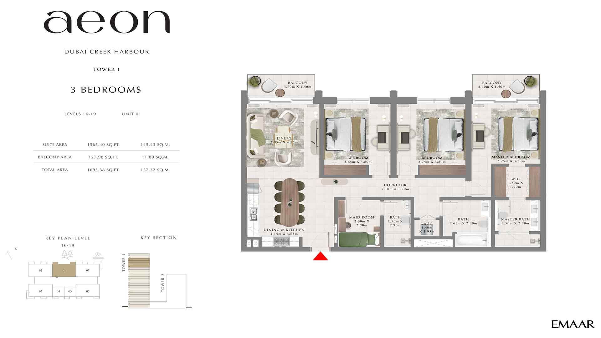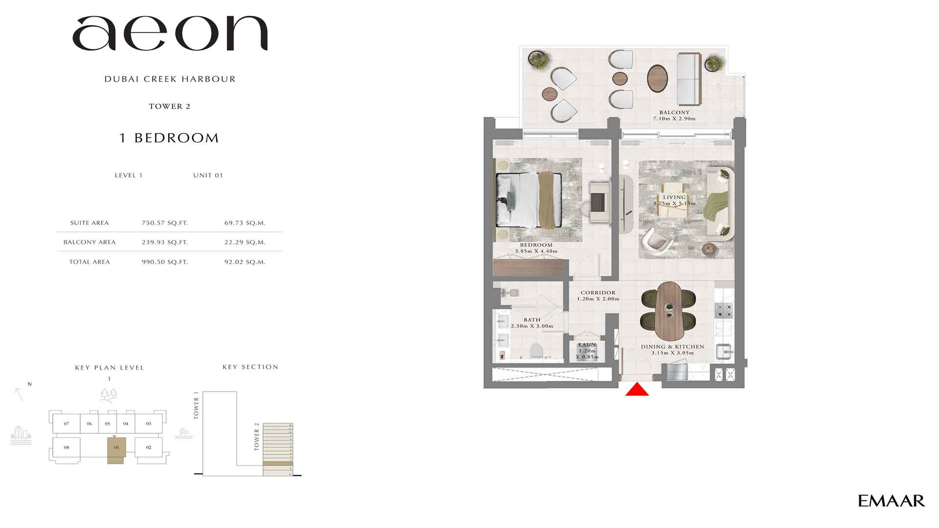 Emaar Aeon is a newly launched luxury residential development property located at Dubai Creek Harbour. This ultramodern, stylish, and pedestrian-friendly neighborhood seamlessly integrates with Dubai’s sustainable urban character. Developed by Emaar Properties, the project offers 1, 2, 3, and 4-bedroom apartments for sale, with sizes ranging from 762 sq.ft to 1,772 sq.ft. This new architectural masterpiece is an attractive investment with amazing ROI and high rental potential, making it the ideal choice for investors. At Emaar Creek Aeon, the sale offer price for a 1-bedroom apartment starts from AED 1.71 million onwards, as of Q1-2024. Emaar Creek Dubai is an off-plan development, and buyers can secure a unit with a 10% booking amount. Creek Harbour enjoys excellent connectivity to prominent Dubai addresses such as Downtown, Business Bay, Sheikh Zayed Road, Za’abeel Park, and Palm Jumeirah.